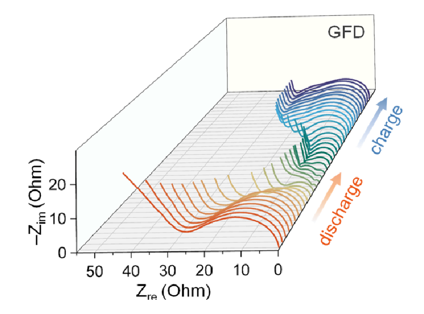 作者對(duì)兩類電池進(jìn)行了原位電化學(xué)阻抗譜測(cè)試,研究發(fā)現(xiàn)采用GFD隔膜的電池阻抗放電時(shí)減小,充電時(shí)增大,而采用PVA隔膜的則全稱保持穩(wěn)定。這與其背后的反應(yīng)機(jī)理有關(guān):PVA隔膜可以使整個(gè)反應(yīng)過程更穩(wěn)定,不存在因?yàn)橐合嗳芙鈱?dǎo)致的阻抗變小。