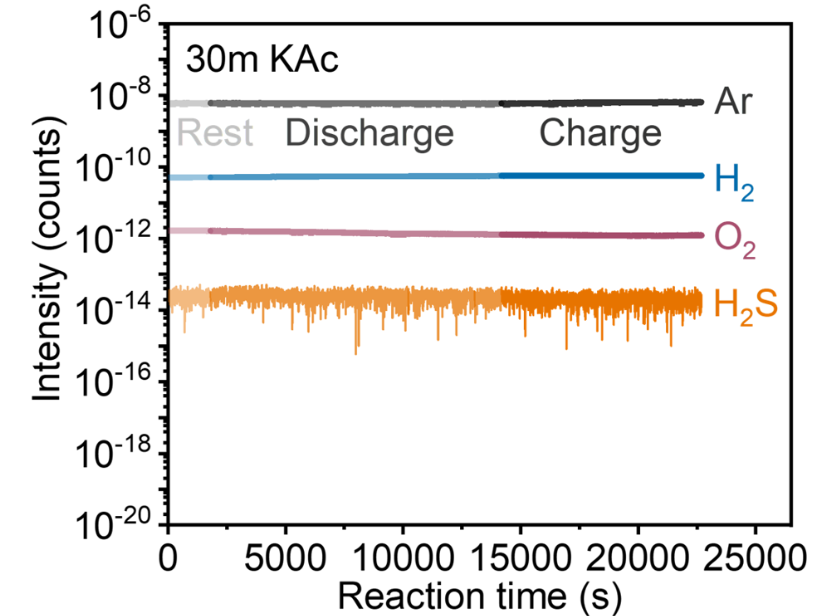 作者對(duì)高濃電解液中硫電極進(jìn)行了產(chǎn)氣監(jiān)測(cè),發(fā)現(xiàn)無(wú)氫氣,氧氣或硫化氫生成,證明了硫電極在該電解液中的反應(yīng)穩(wěn)定性。