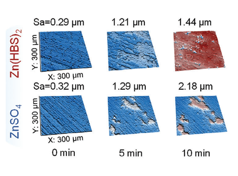 作者監(jiān)測(cè)了鋅負(fù)極在不同電解液下鋅沉積的形貌演變過程,證明了在優(yōu)化的電解液中鋅沉積更加均勻。