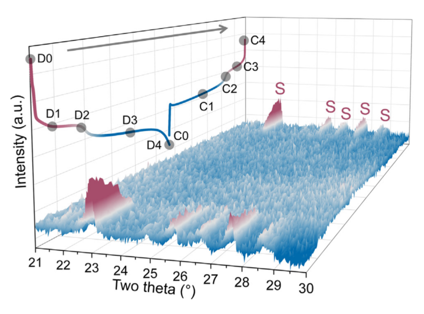 作者對(duì)水系硫電極進(jìn)行了原位XRD測(cè)試,發(fā)現(xiàn)硫電極在放電時(shí)峰逐漸消失,在充電時(shí)峰重新出現(xiàn),這證明硫電極發(fā)生了轉(zhuǎn)化反應(yīng),同時(shí)電極也具有高度可逆性。