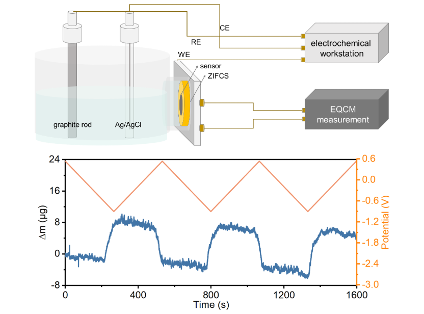 作者利用電化學(xué)石英晶體微晶天平(EQCM)監(jiān)測(cè)了硫電極在充放電時(shí)的質(zhì)量變化,一方面證實(shí)了點(diǎn)電化學(xué)反應(yīng)的可逆發(fā)生,另一方面又發(fā)現(xiàn)了循環(huán)過程中電極物質(zhì)的持續(xù)損失。