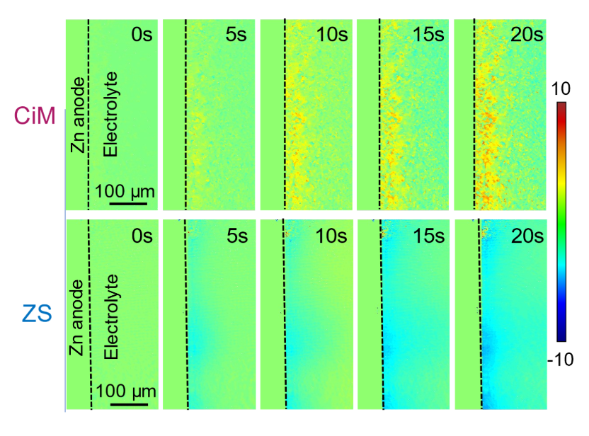 作者對(duì)鋅金屬負(fù)極進(jìn)行了界面修飾,通過原位監(jiān)測(cè)界面處的離子濃度分布,證實(shí)了特定修飾可以促進(jìn)鋅離子擴(kuò)散,從而避免鋅枝晶形成。