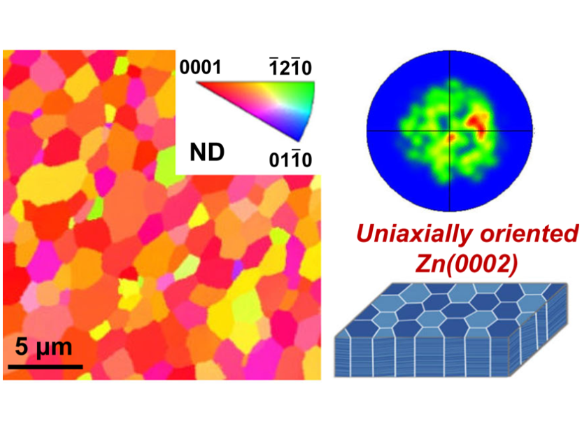 作者對(duì)兩類不同鋅負(fù)極進(jìn)行了晶體學(xué)取向測(cè)試,發(fā)現(xiàn)Com-Zn顆粒尺寸與晶體取向分布均不均勻。作為對(duì)比,另一中Zn不僅尺寸均勻而且整體取向一致。這種[0001]取向結(jié)構(gòu)有利于避免枝晶形成同時(shí)保持結(jié)構(gòu)穩(wěn)定