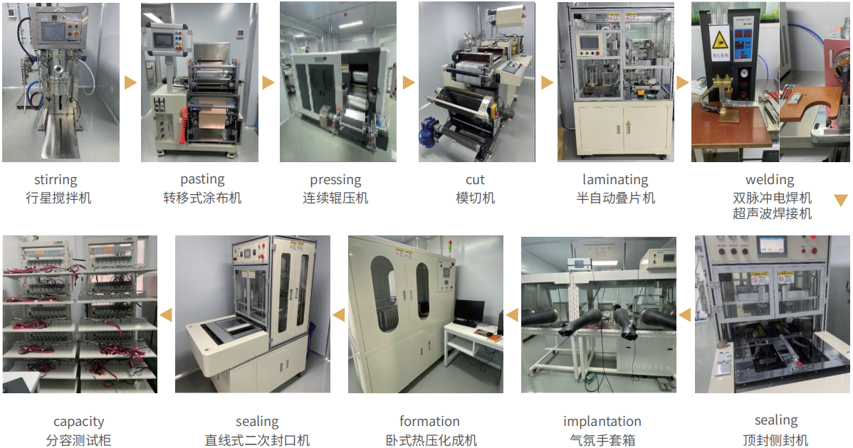 Assembling 電池裝配:Welding 焊接-->Stack 疊片,Winding 卷繞---> lmplantation 注液--->Sealing 封裝