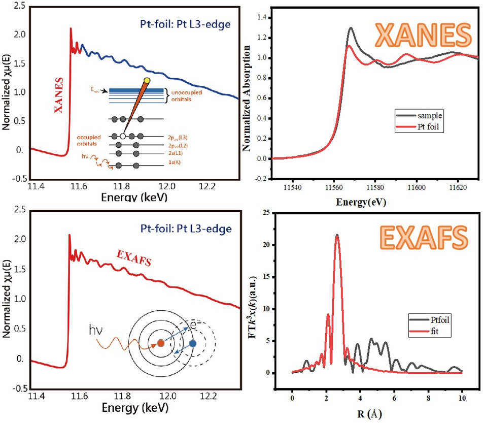 同步輻射光源與傳統(tǒng)X光射源的最大差異為可提供能量連續(xù)且高強度的光源,同時具有極佳的偏振性。利用此特點的代表技術(shù)即為X射線吸收能譜(X-ray absorption spectroscopy: XAS),分為兩個觀測范圍:X射線近吸收邊精細(xì)結(jié)構(gòu)(XANES)及延伸X射線吸收精細(xì)結(jié)構(gòu)(EXAFS)。