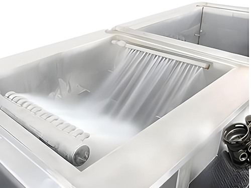 4:漂洗槽,為長方形結(jié)構(gòu),中間隔開,分兩道清洗,清洗盲孔余膠功能,底部裝有氣助鼓泡攪拌裝置,有吊籠放置架,一般清洗時間2分鐘/次,吊出后用氣吹去表面和盲孔里的水份,然后放入熱水箱。
